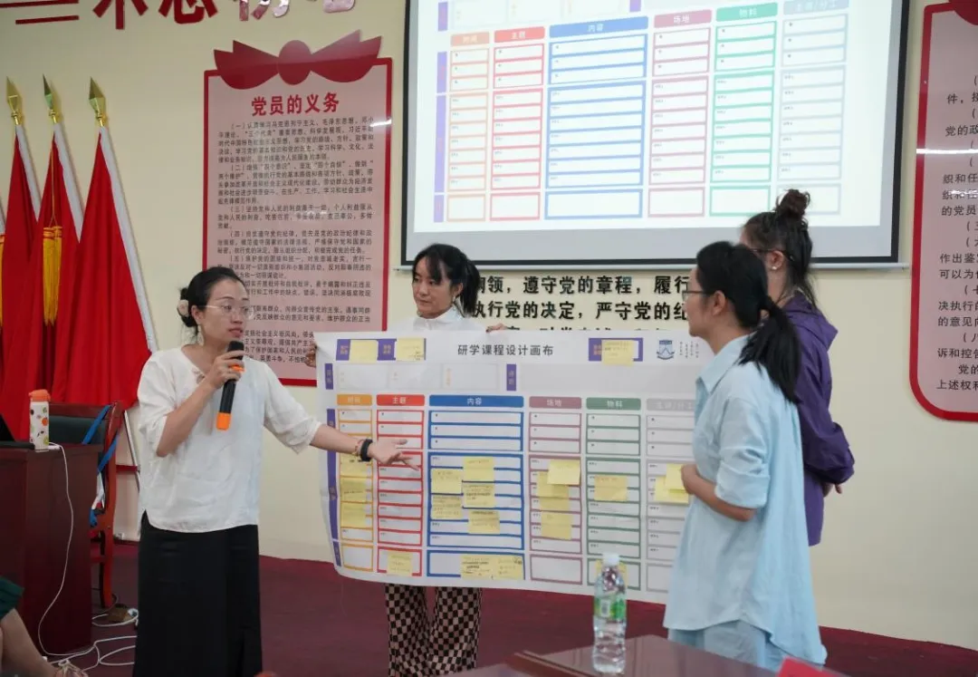 随后,在 《一张画布高效转化研学课程》(工作坊)中,陈琛老师引导各组参训人员进行现场实践。在学习了“研学课程设计画布”的应用原理后,通过高强度、高密度的团队协作,在1小时内快速完成了研学产品框架的设计。在课程设计过程中,陈琛老师还引入了前沿的AI技术,现场演示了如何利用AI工具快速生成规范的研学课程方案,极大地提升了课程开发的效率与创新性。现场学习氛围热烈,思维碰撞不断,八个小组均结合我所科研成果设计出针对不同客户群体、不同研究方向的特色研学课程。