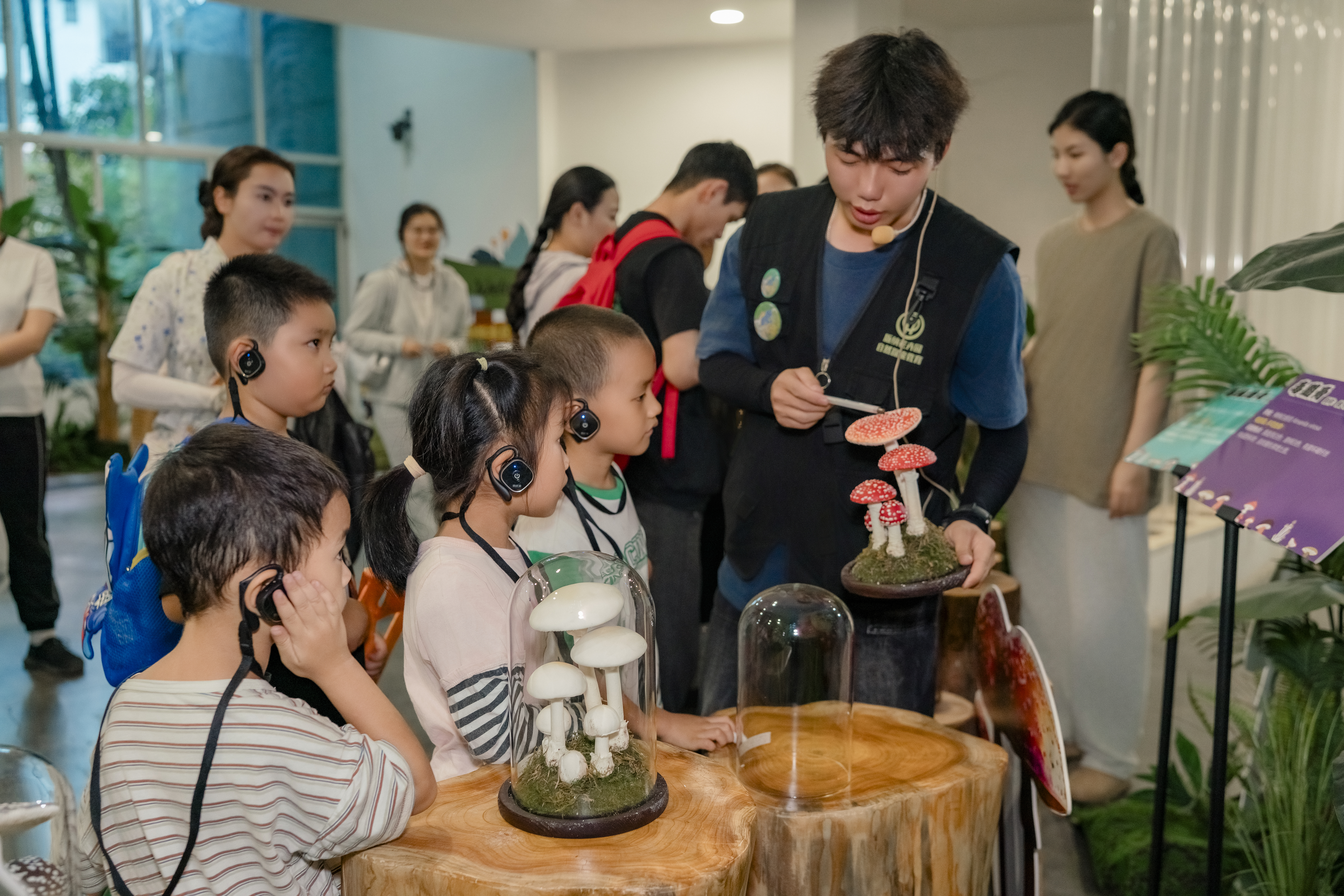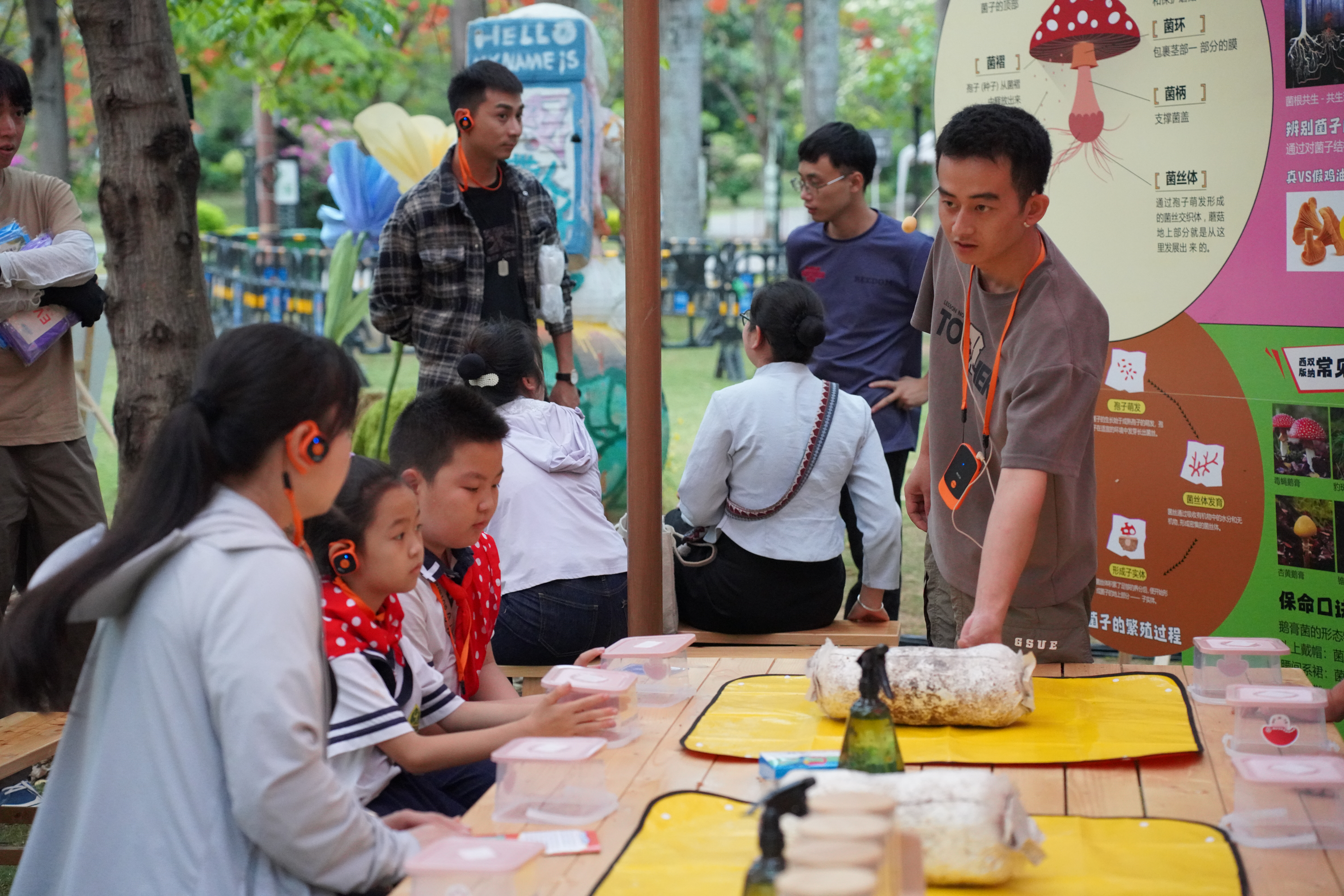 《探秘菌子“蘑”力方舱》由专业研学老师讲解从菌丝发育到孢子释放的菌子完整一生、菌子的各部位名称、不同菌子的生活方式,以及科普如何鉴别菌子是否带有毒性。在专业导师的讲解下,参与者见证菌种从孢子到子实体的奇妙“变形记”:孢子在适宜温度下萌发,菌丝如白色“丝线”在培养基中蔓延生长,逐渐交织成密集的菌丝网络;随着环境调控,菌丝扭结形成原基,进而发育成子实体,最终长成可供食用的菌子。方舱知识点讲解结束后,跟随导师一起手工制作菌包,将科学“点废成菌”融入“废物识别—科学转化—生态价值量化”,实现全链条菌菇研学教育,让学员在培育菌菇过程中深度理解小小菌子的神奇“蘑力”。